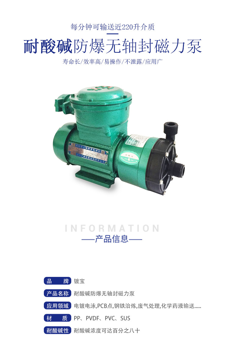 防爆磁力泵因?yàn)橛兄?dú)特的設(shè)計(jì)擁有防爆裝置,即使輸送的液體帶有易燃易爆性質(zhì),也不會(huì)產(chǎn)生爆炸。